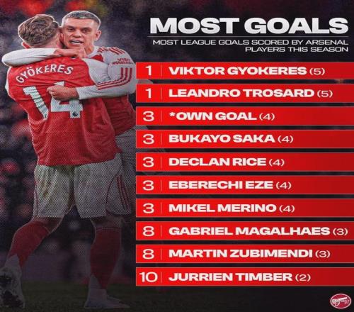 23輪英超比賽之后,阿森納隊內聯賽最佳射手: