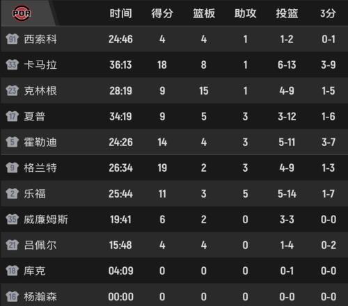 夏普、樂福的投籃效率均為7中1,斯普利特就是不給楊瀚森機會,呂佩爾都打了7分多鐘,小楊枯坐板凳。第三節開拓者一度落后20分,之后開拓者不斷在籃下造犯規,卡馬拉命中2記關鍵三分,當樂福在反擊中上籃命中,開拓者追至56-66,打停凱爾特人。布朗造成殺傷罰球2進1,夏普拉桿上籃打板命中,差9分了。凱爾特人的謝爾曼補籃得手,格蘭特上罰球線2罰都進。